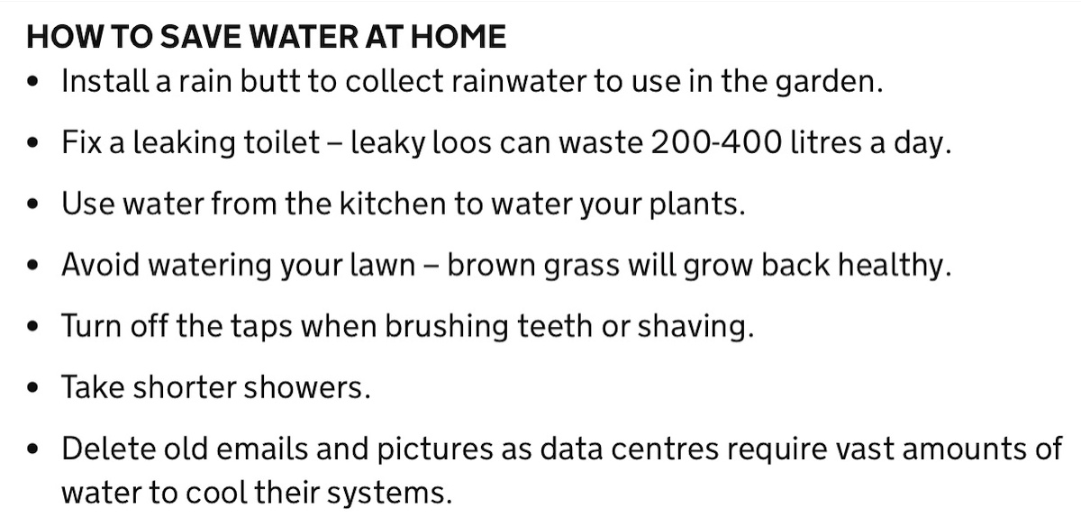 Neben üblichen und erwartbaren Ratschlägen wie denen, kürzer zu duschen, Regenwasser in Regentonnen zu sammeln und auf das Sprengen des Rasens zu verzichten, verwunderte ein Punkt ganz am Ende der Liste: Man solle alte Fotos und E-Mails löschen, da die Serverfarmen, in denen sie gespeichert seien, wertvolles Wasser zur Kühlung verwenden müssten.