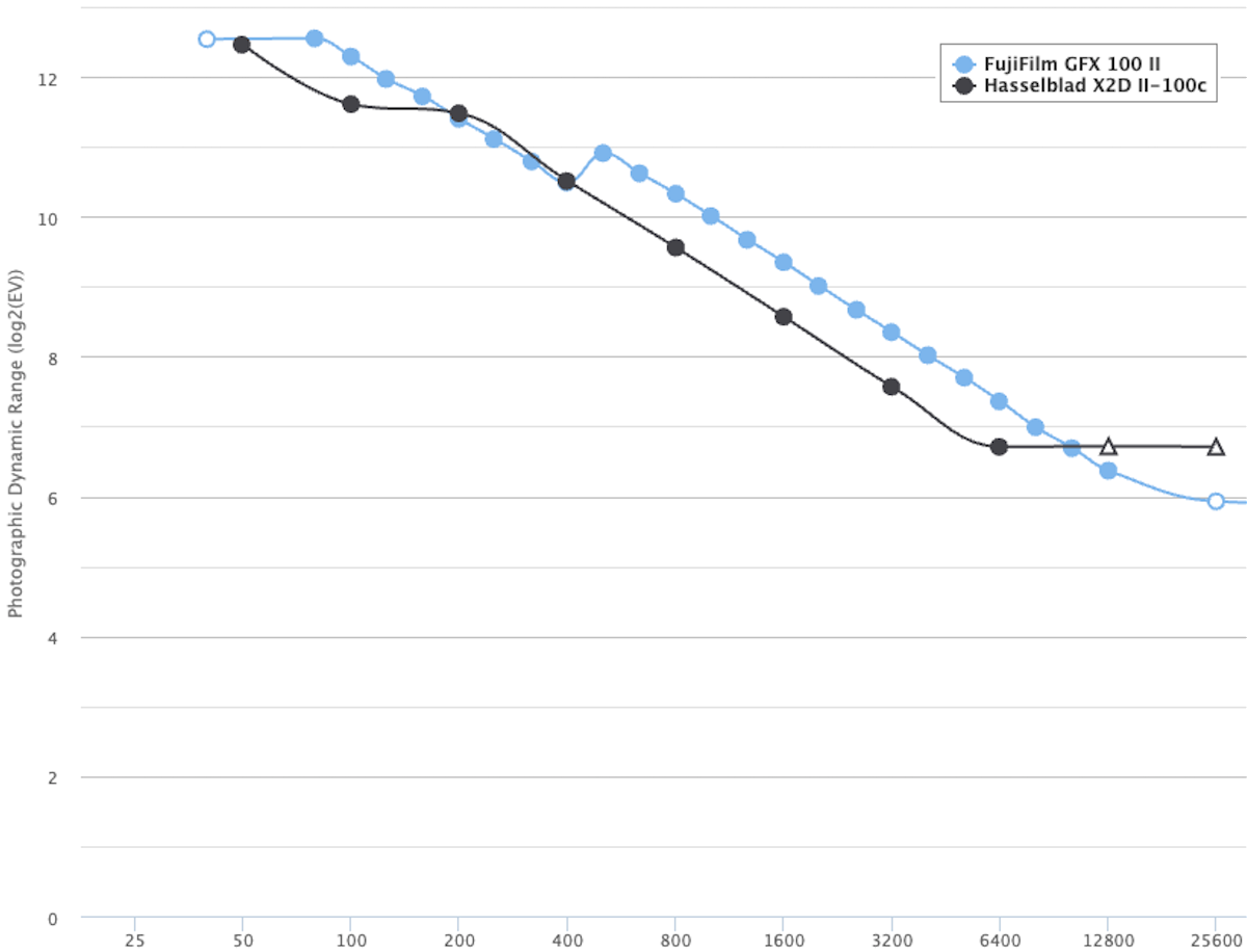 In einem Artikel bei PetaPixel stellt dessen Autor die steile These auf, die X2D II 100C hätte der in dieser Disziplin führenden Fuji GFX100 II „fast die Dynamikumfangskrone entrissen“. Dabei stützt er sich auf die Messergebnisse von PhotonsToPhotos, die aber schon auf den ersten Blick ein ganz anderes Bild zeichnen: