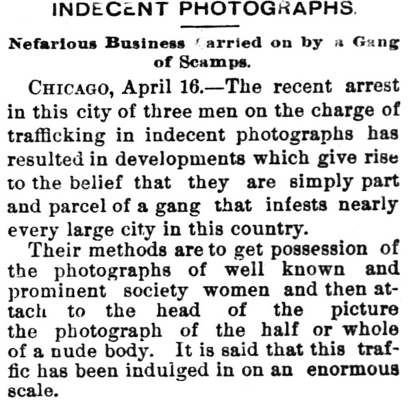 Am 17. April 1891 meldete das Topeka Capital Journal die Verhaftung einer dreiköpfigen Bande: „Ihre Methode ist, sich Fotos bekannter und prominenter Damen der Gesellschaft zu verschaffen und den Kopf in diesen Bildern auf das Foto eines halb oder völlig nackten Körpers zu montieren.“ Mutmaßlich seien die „Spitzbuben“ („Scamps“) Mitglieder einer größeren Organisation, die in allen größeren Städten der USA aktiv wäre und mit solchen Bildern handelte.