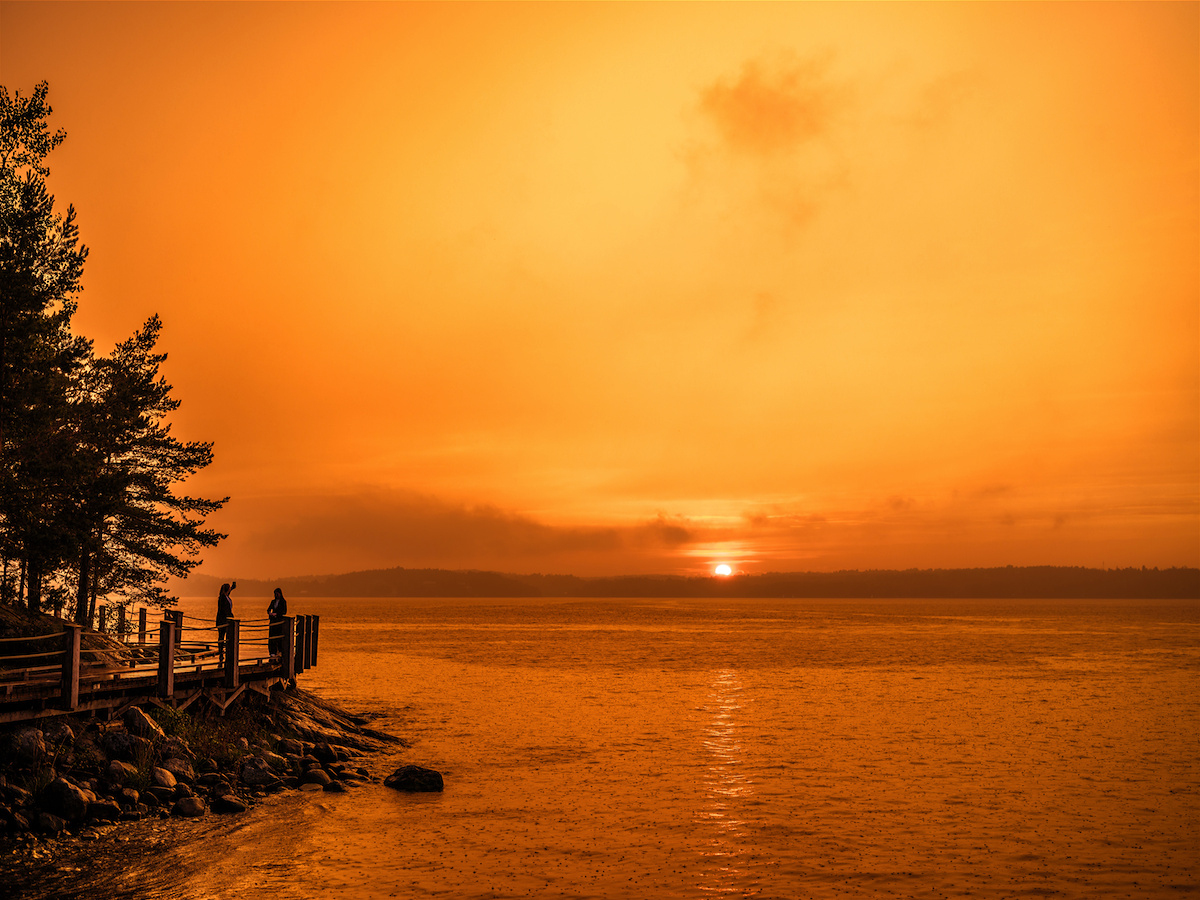 Kurz vor dem Sonnenuntergang (und ebenso nach dem Sonnenaufgang) verfärbt sich der Himmel gelb. Diese Goldene Stunde entsteht, weil der Einfluss der Rayleigh-Streuung bei streifendem Lichteinfall zurückgeht und das überwiegend langwellige direkte Sonnenlicht dann die Farbe des Himmels bestimmt.